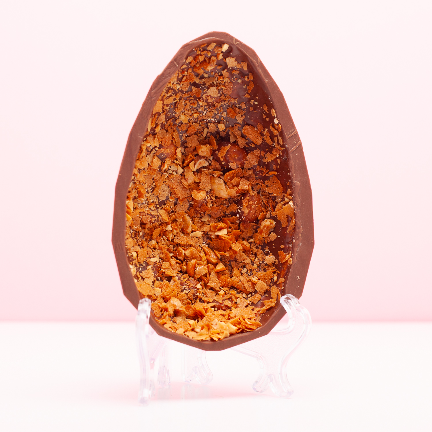 Milk chocolate Demi egg filled with peanut praline, honey roasted peanuts, and feuilletine crunch. Rich, crunchy, nutty. Net wt: 150g