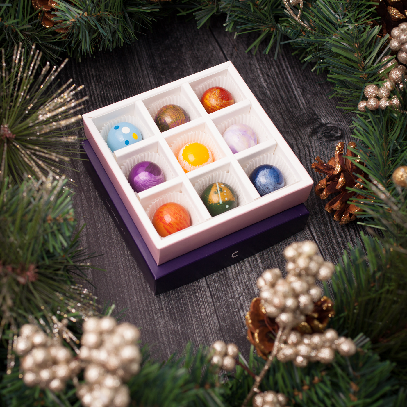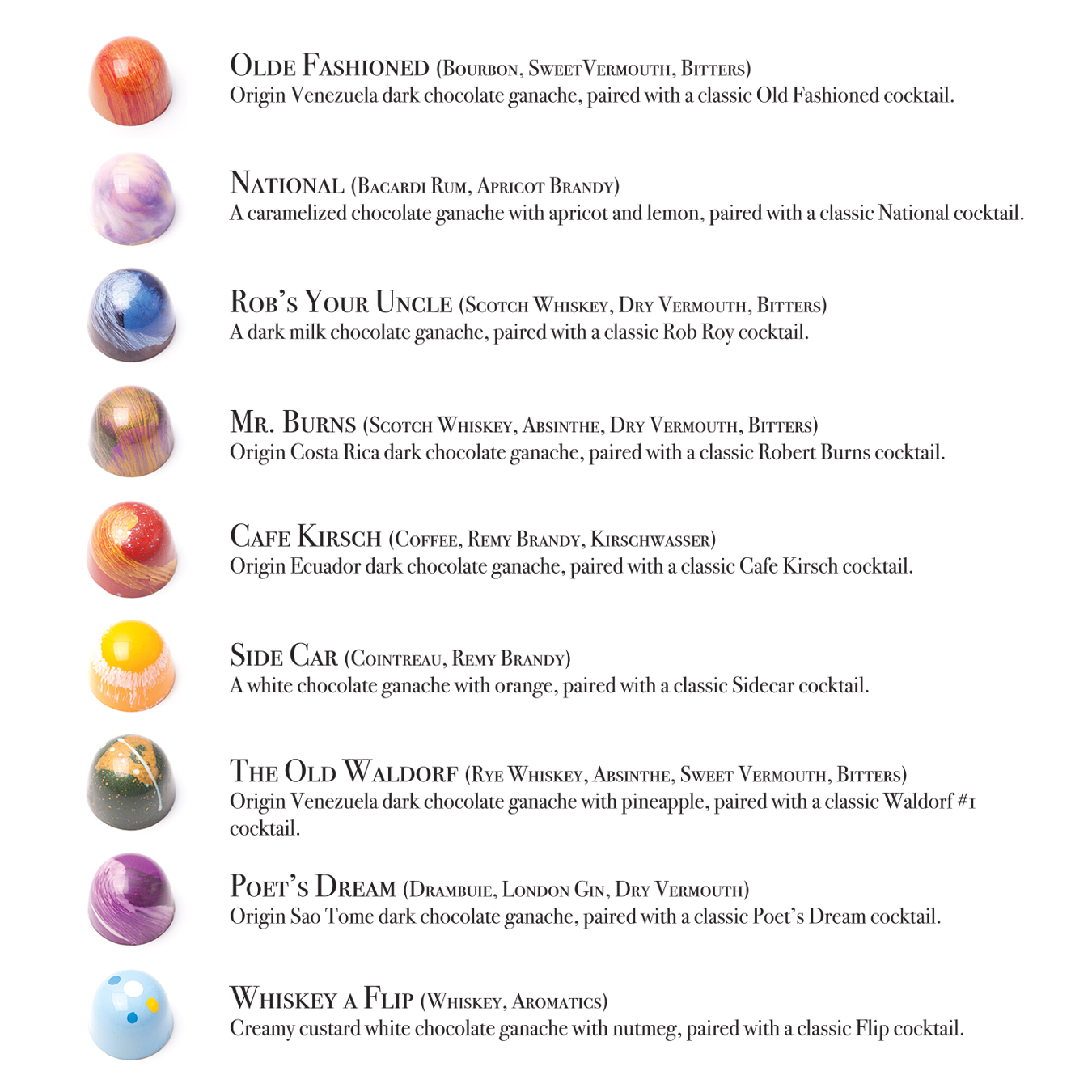 This collection of chocolate bonbons, crafted by The Chocolate Lab, represents an homage to nine classic pre-prohibition cocktails, using authentic cocktail preparations inspired by the 1935 Waldorf-Astoria bar book. Each cocktail is crafted with high-quality spirits and paired with complimentary fine chocolates sourced from different cacao-growing regions.