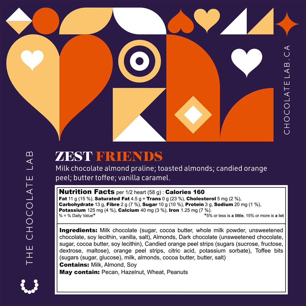 Almond praline, caramel, candied orange peel, and toffee bits wrapped in milk chocolate form a chocolate heart that’s warm, nostalgic, and full of citrus-kissed crunch.